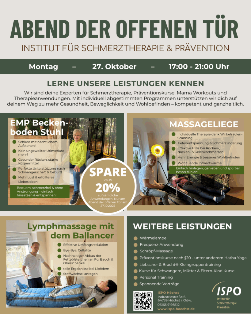 Am Montag, den 27. Oktober, von 17:00 bis 21:00 Uhr öffnen die Türen im Institut für Schmerztherapie & Prävention (ISPO) für dich!